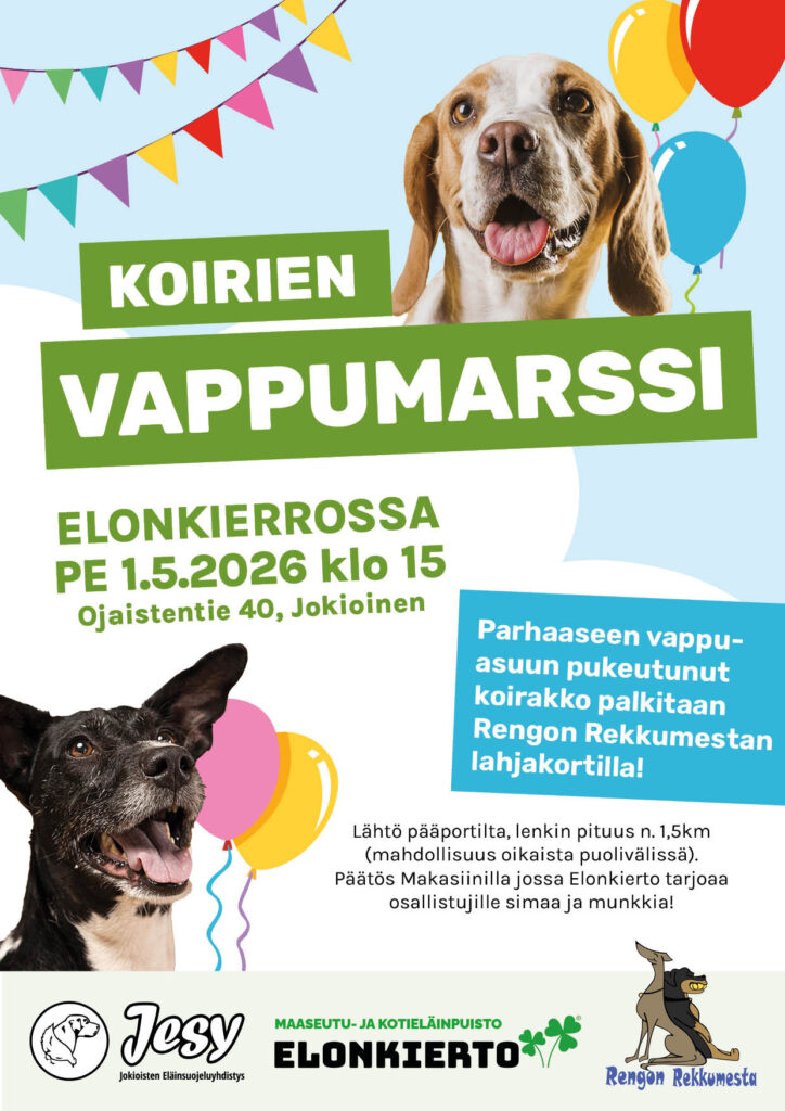 Jokioisten Eläinsuojeluyhdistys järjestää koirien Vappumarssin vappupäivänä, perjantaina 1.5.2026 klo 15! Värikkäälle kävelylenkille ovat tervetulleita kaikenkarvaiset koiraystävät (myös lelukoirat). Parhaaseen vappuasuun pukeutunut koirakko palkitaan Rengon Rekkumestan lahjakortilla!